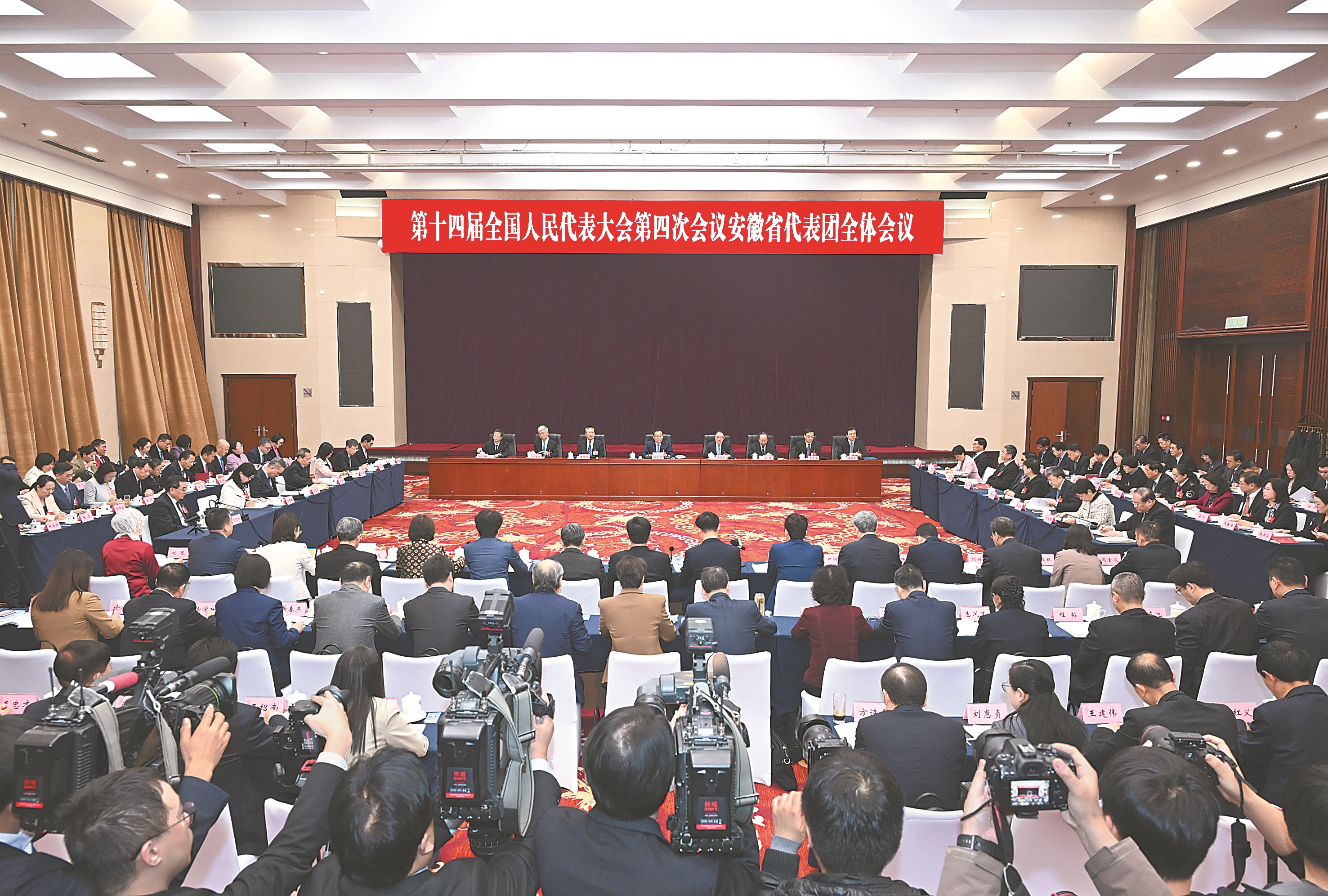 三月六日上午,十四届全国人大四次会议安徽代表团举行团组会议,中外媒体把镜头投向安徽代表团,进一步探索美好安徽建设发生的新变化、取得的新成就。本报记者 杨竹 摄